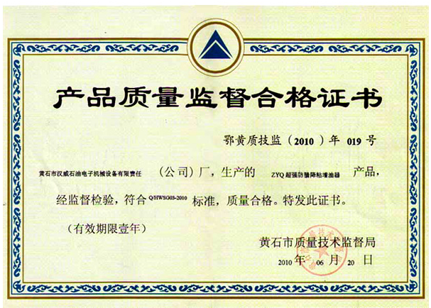 - ZYQ超强防蜡降粘增油器通过产品质量检验合格认证
