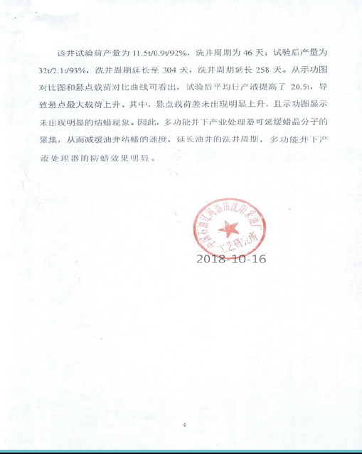 辽河油田使用结论:2018年10月投入试验井,试验前产量为11.5t/0.9t/92%,洗并周期为46天;试验后产量为32t/2.1t/93%,检泵周期延长为304天,洗井周期延长258天。从示功图、对比图和悬点载荷对比曲线可看出,试验后平均日产液提高了20.5t,且示功图显示未出现结蜡现象。